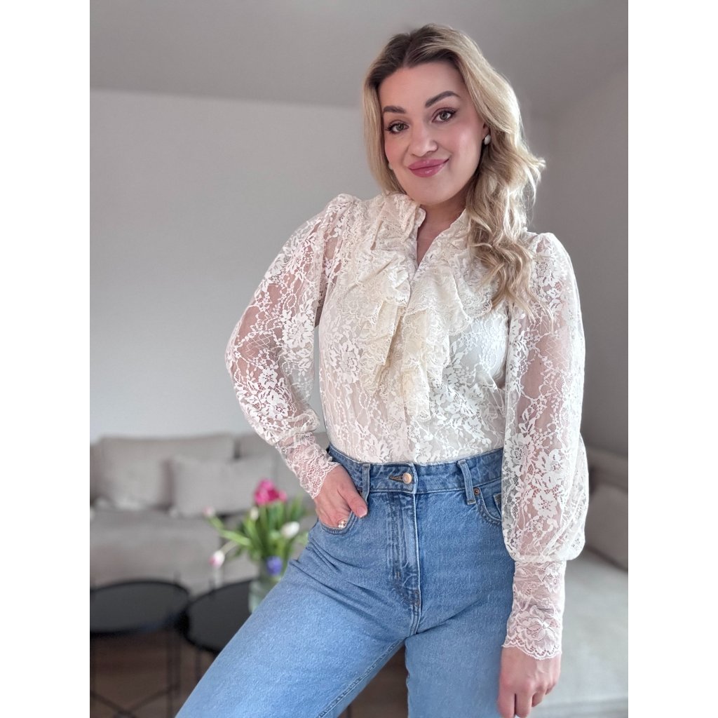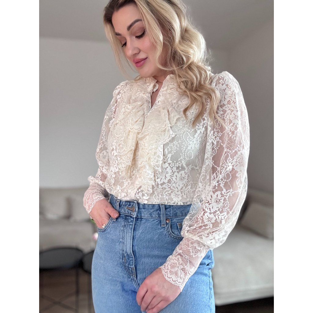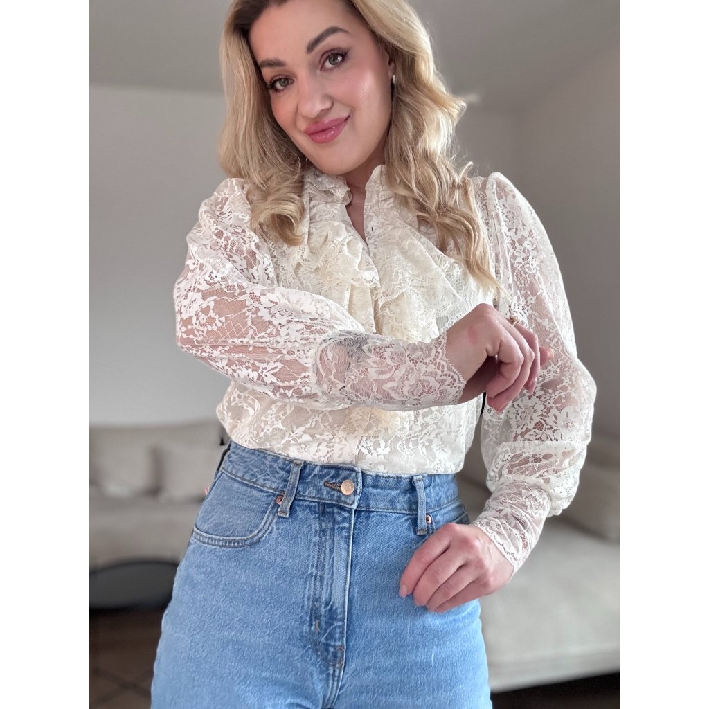 Dámska čipkovaná blúzka v jemnej smotanovej farbe je krásny kúsok pre ženy, ktorú obľúbujú ženskosť a eleganciu. Blúzka sa hodí na akúkoľvek príležitosť.