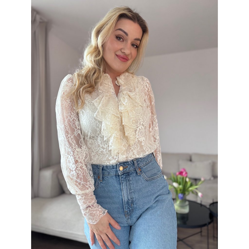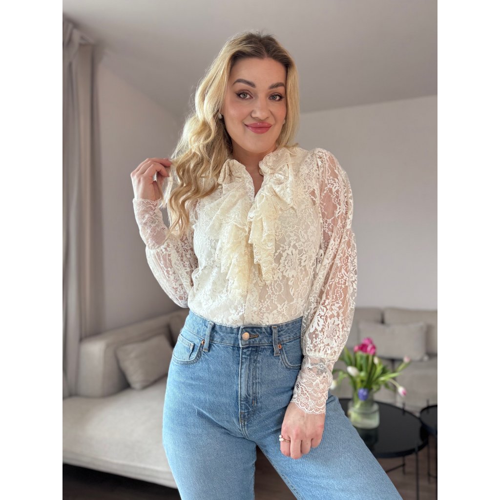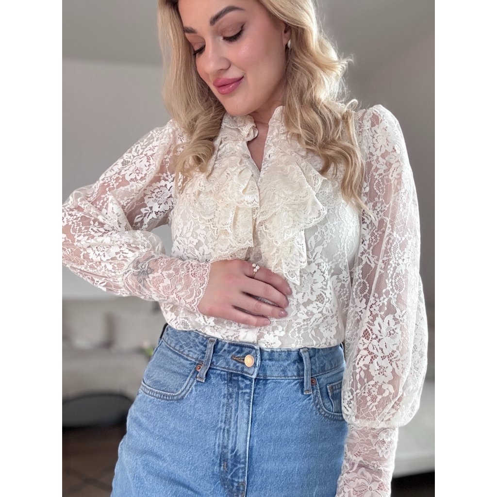 Dámska čipkovaná blúzka v jemnej smotanovej farbe je krásny kúsok pre ženy, ktorú obľúbujú ženskosť a eleganciu. Blúzka sa hodí na akúkoľvek príležitosť.