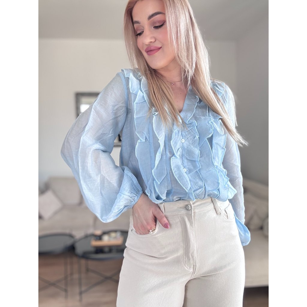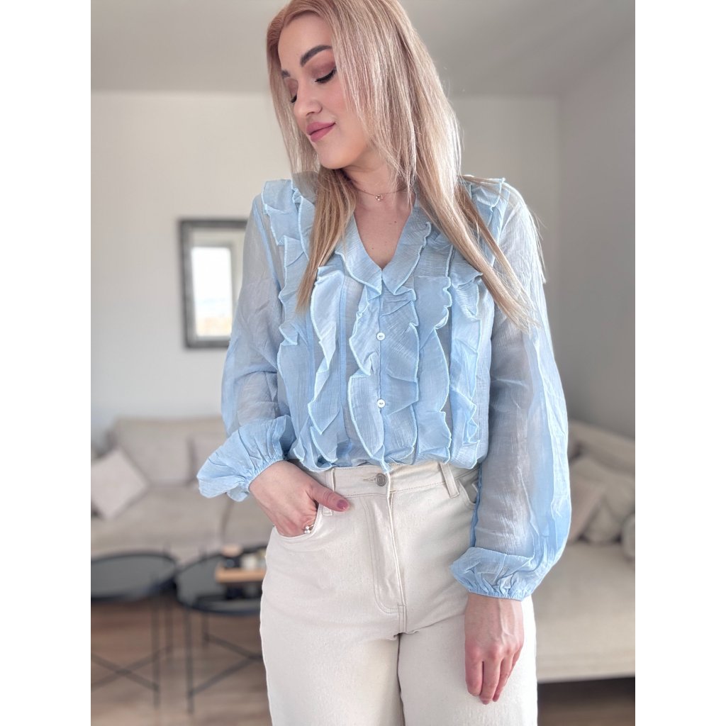 Dámska transparentná blúzka v peknej bledomodrej farbe, je ušitá z jemného materiálu, je zdobená volánmi, čo jej pridáva na ženskosti. Môžete ju kombinovať k nohaviciam, sukni, rifliam alebo krátkym nohaviciam. Hodí sa ako na bežný deň, tak aj na večer.