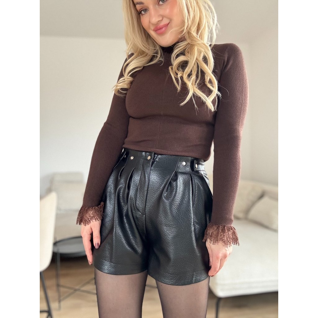 Dámske koženkové kraťasy s vysokým pasom, zapínanie na zips, sú ušité z veľmi príjemnej a kvalitnej koženky...