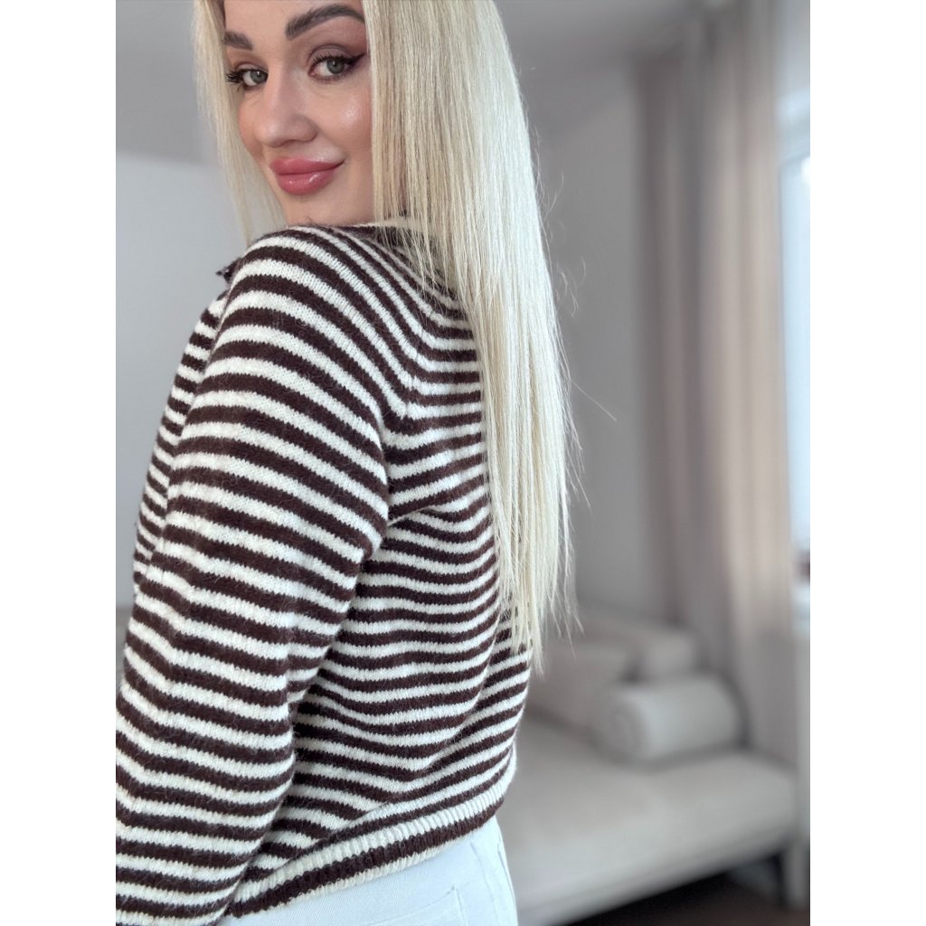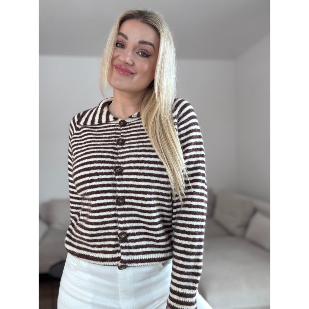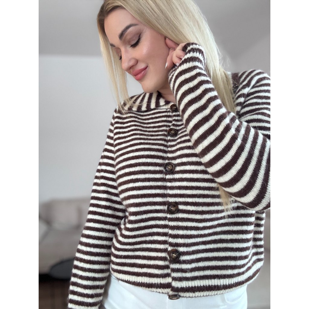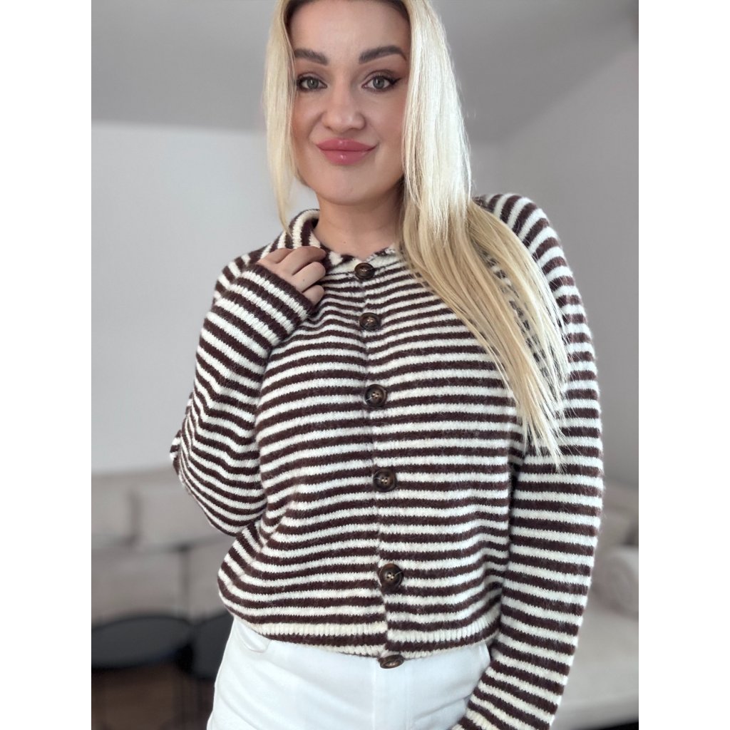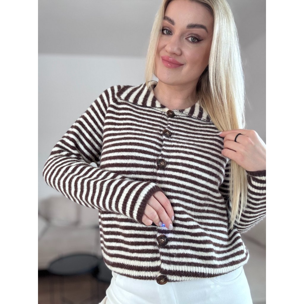 Dámsky pletený sveter s prúžkami v hnedo-krémovej farebnej kombinácií, má zapínanie na gombíky, materiál je veľmi príjemný.