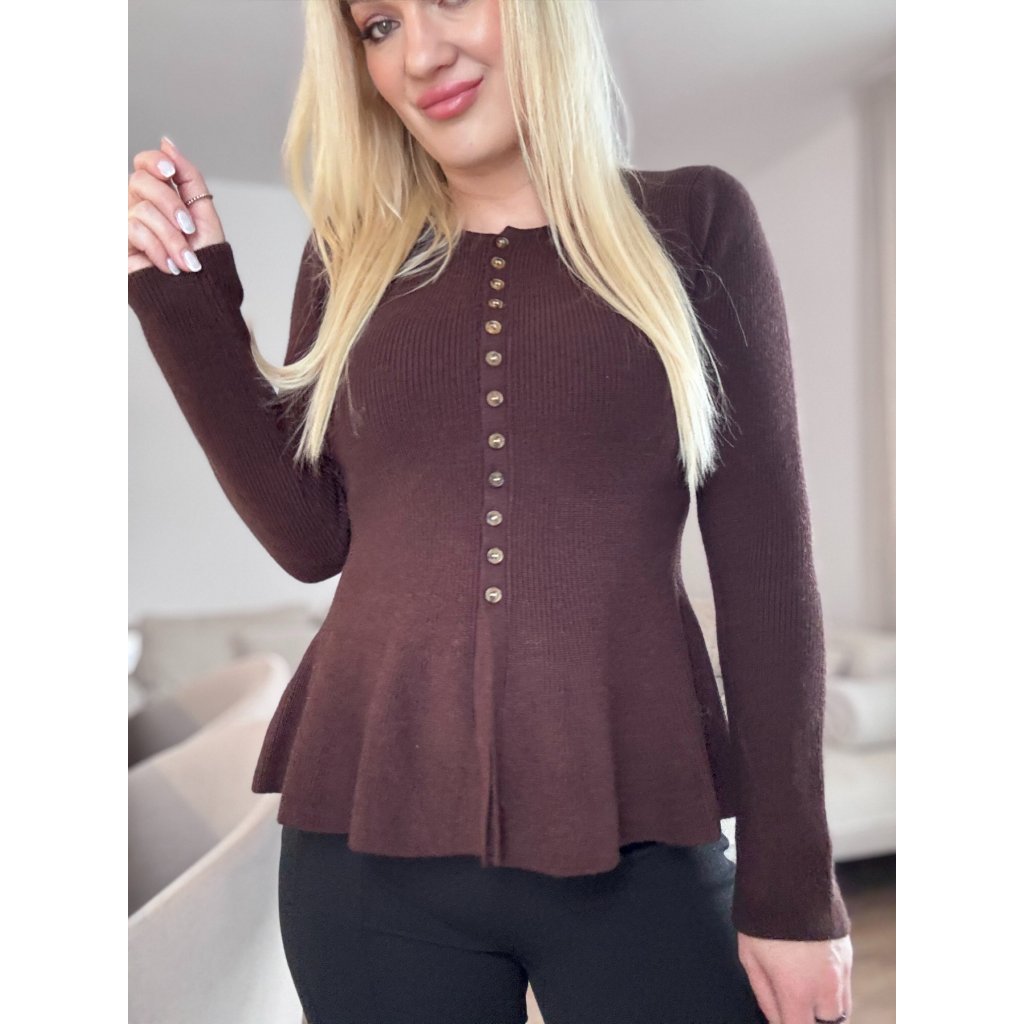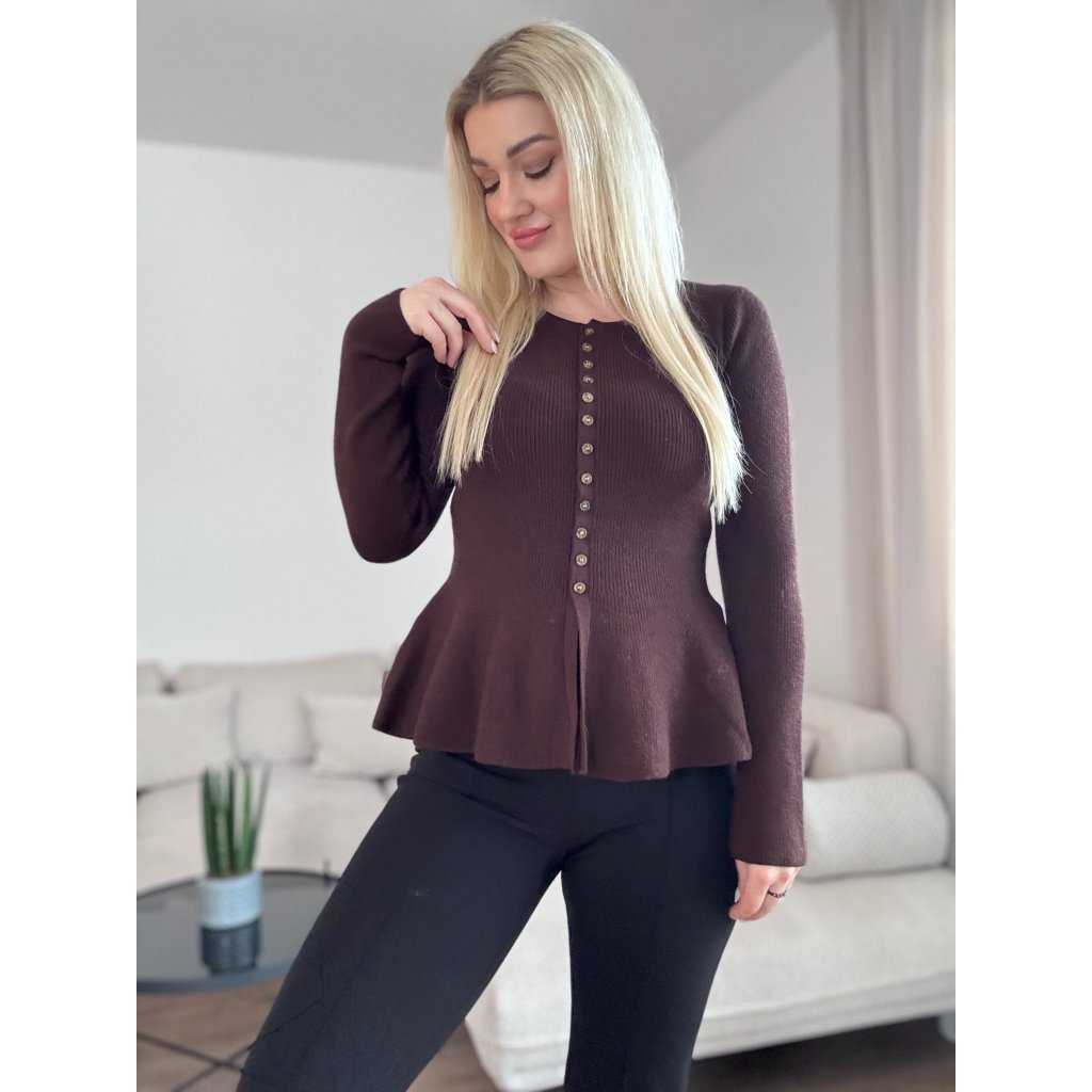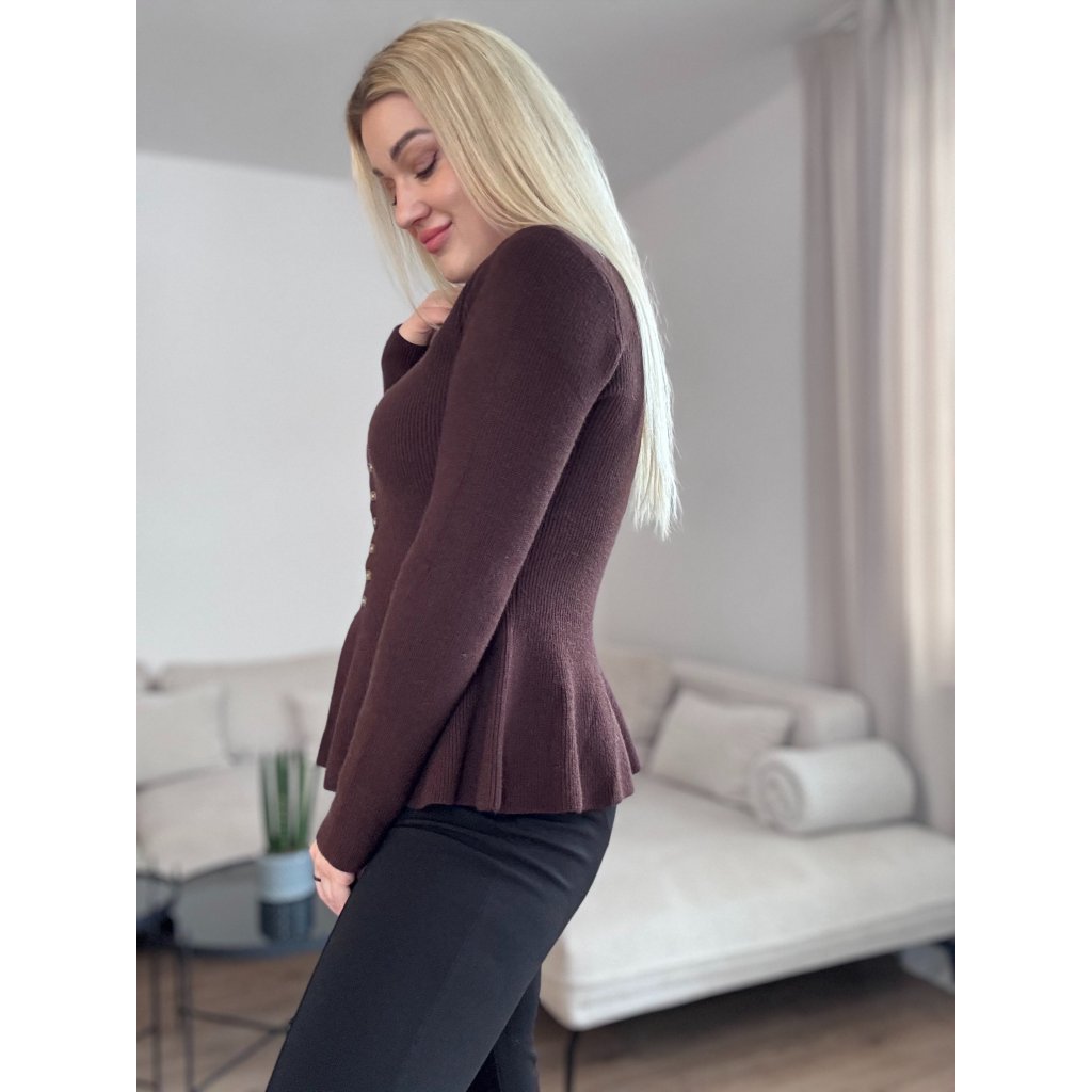 Dámsky sveter v obľúbenom peplum strihu, pri ktorom je zvýraznený pas, čo vytvára krásnu ženskú siluetu. Je z kvalitného a príjemného materiálu.