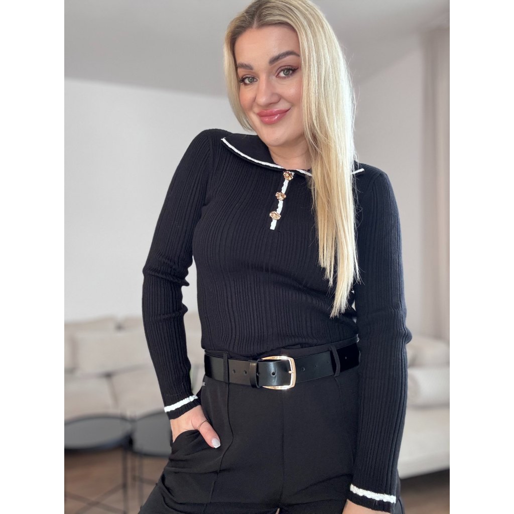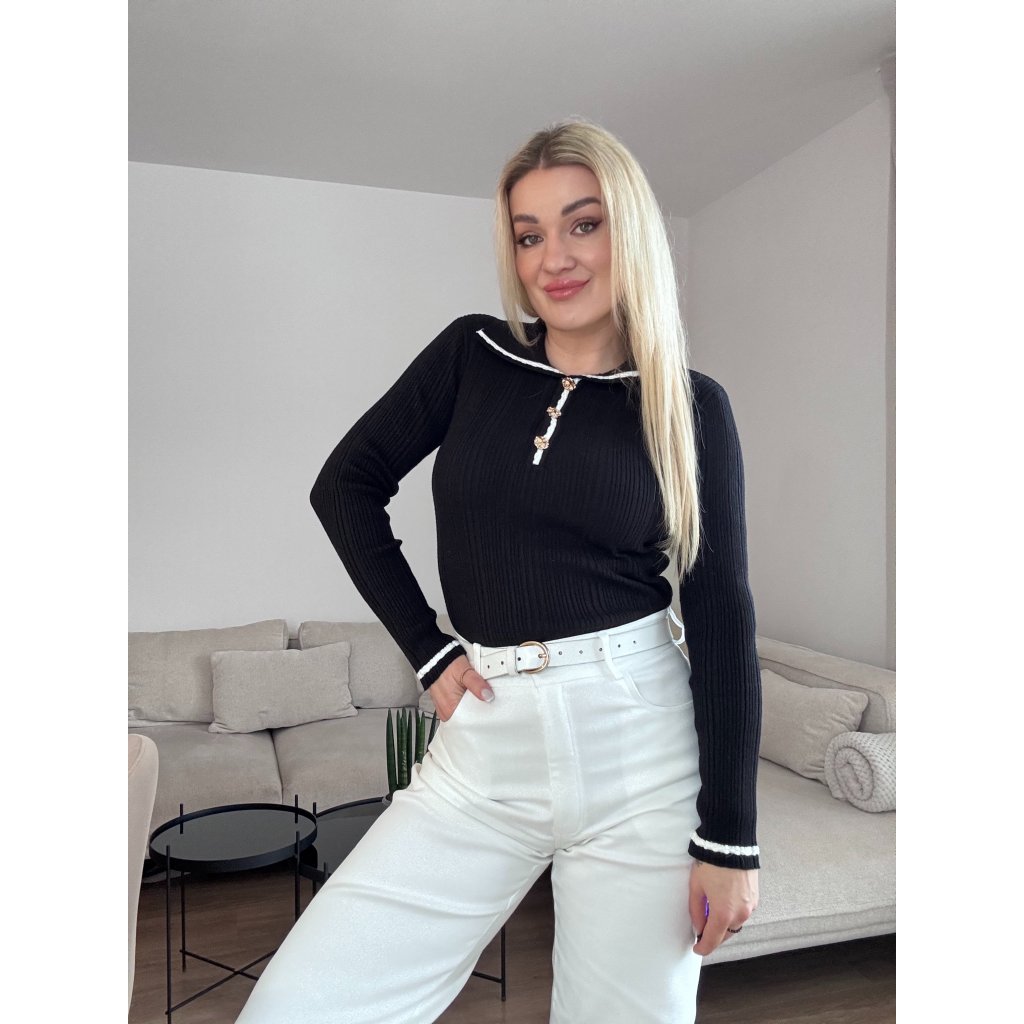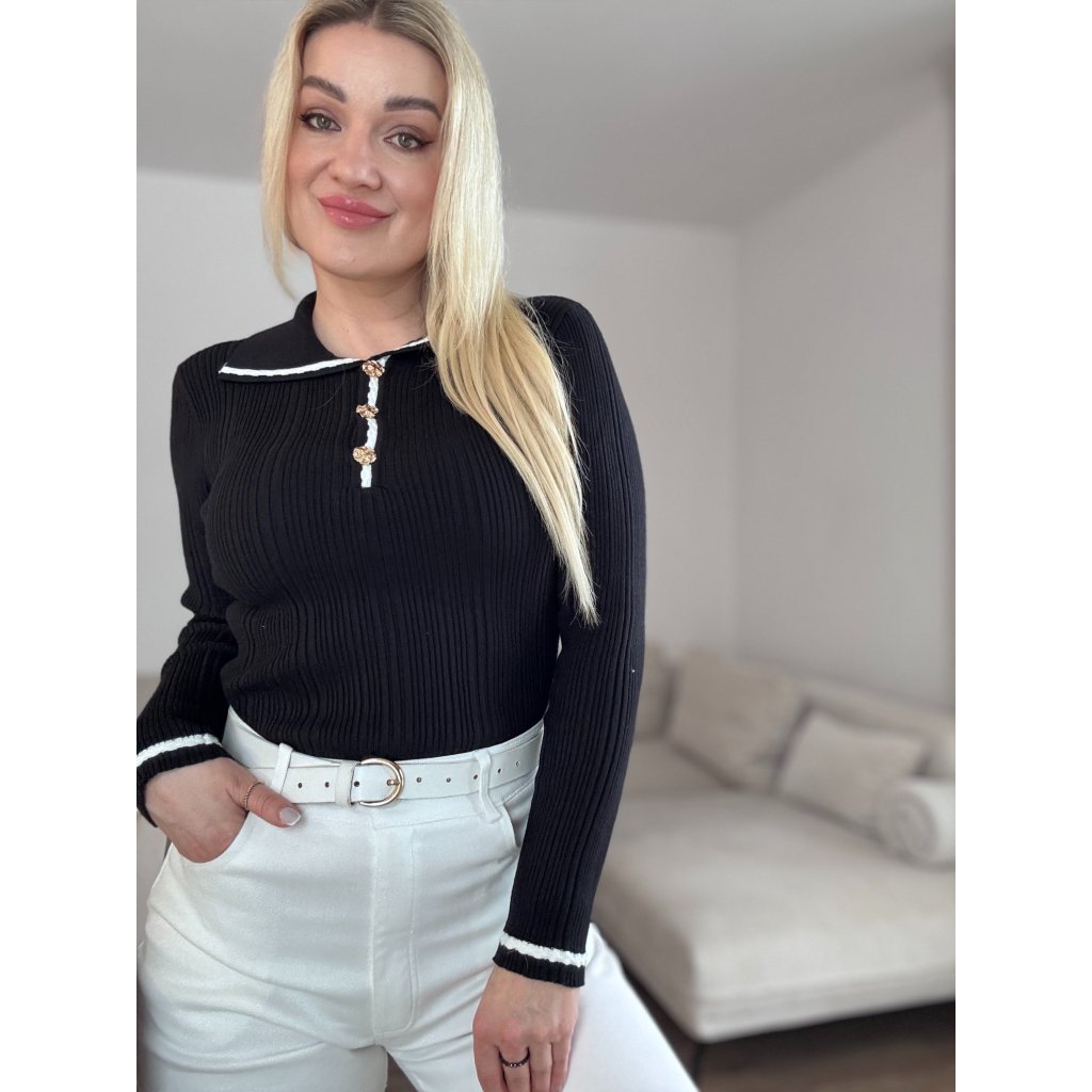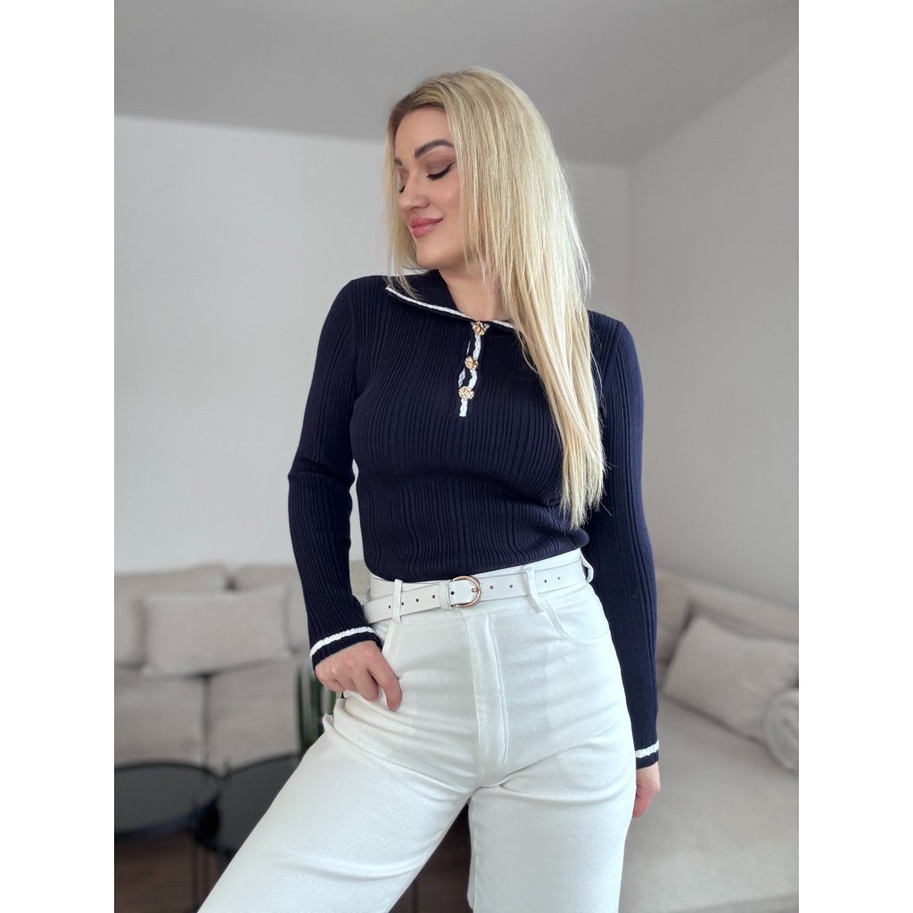 Dámsky rebrovaný pulover v priliehavom strihu s bielym lemovaním na golieri a manžetách. Je zdobený zlatými gombíkmi. Materiál je jemný, elastický a veľmi príjemný.