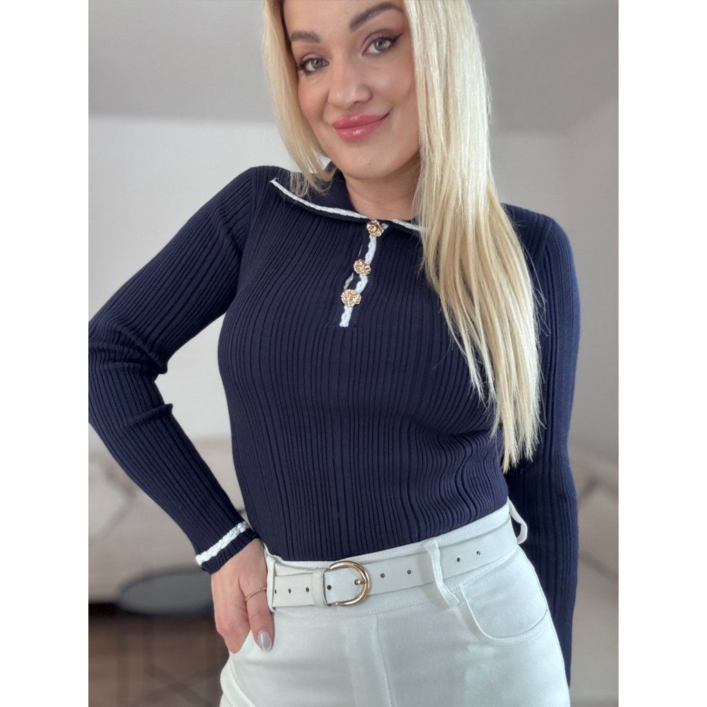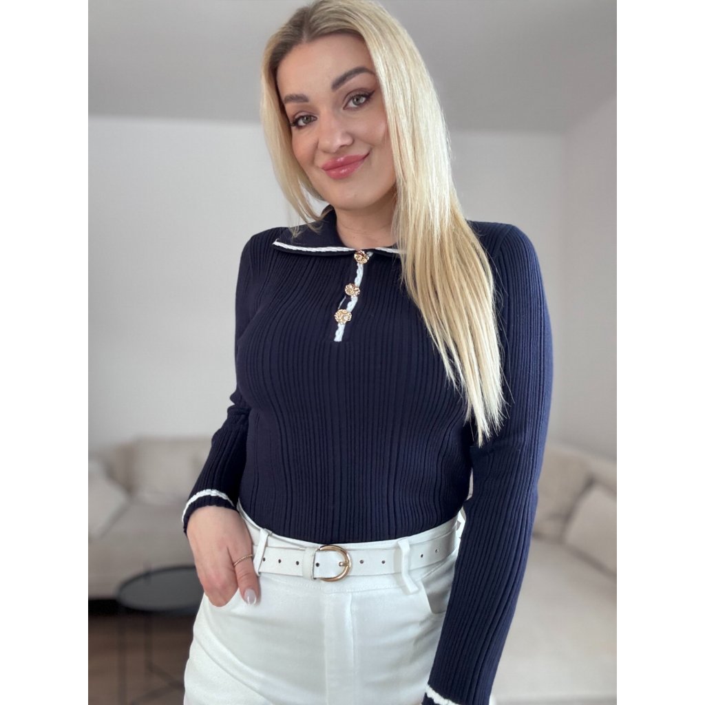 Dámsky rebrovaný pulover v priliehavom strihu s bielym lemovaním na golieri a manžetách. Je zdobený zlatými gombíkmi. Materiál je jemný, elastický a veľmi príjemný.