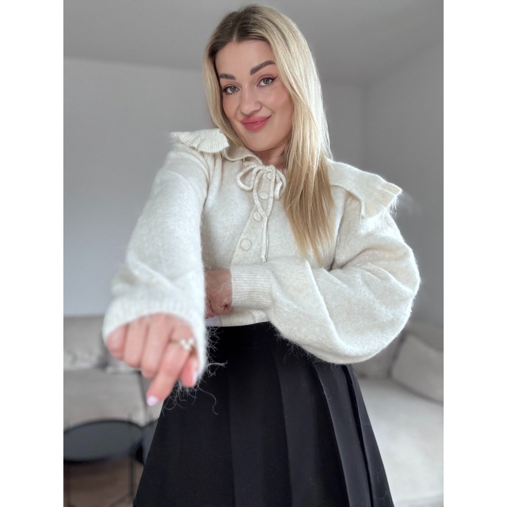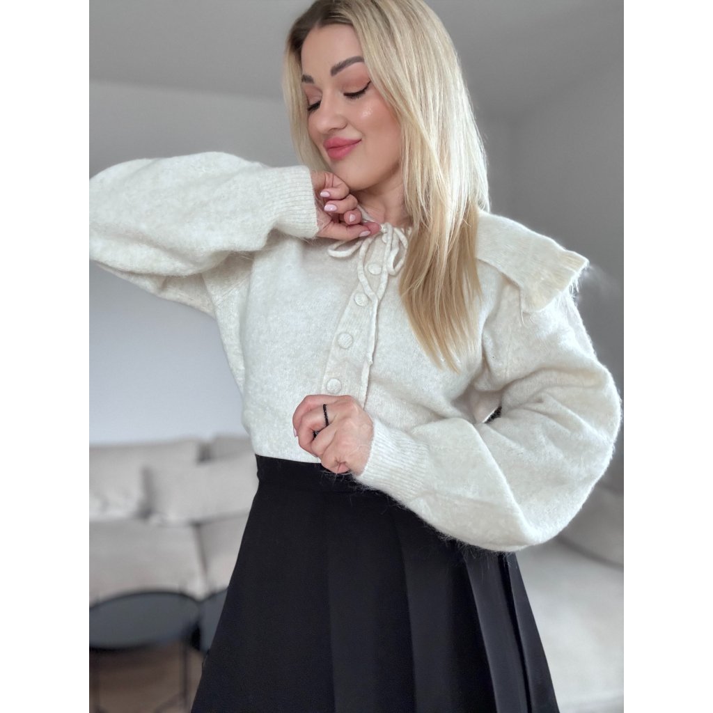 Dámsky úpletový sveter so zaujímavým volánovým golierikom, zapínanie má na gombíky. Ma jemne oversize strih. Je z kvalitného materiálu.
